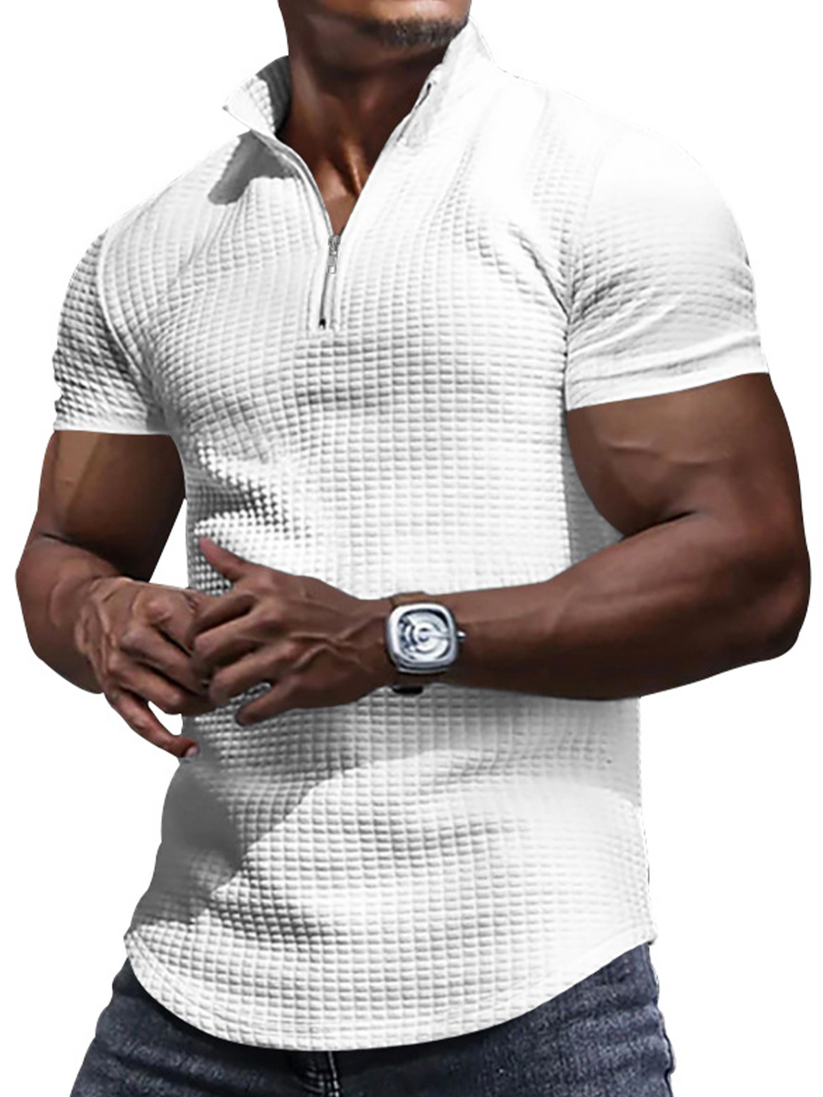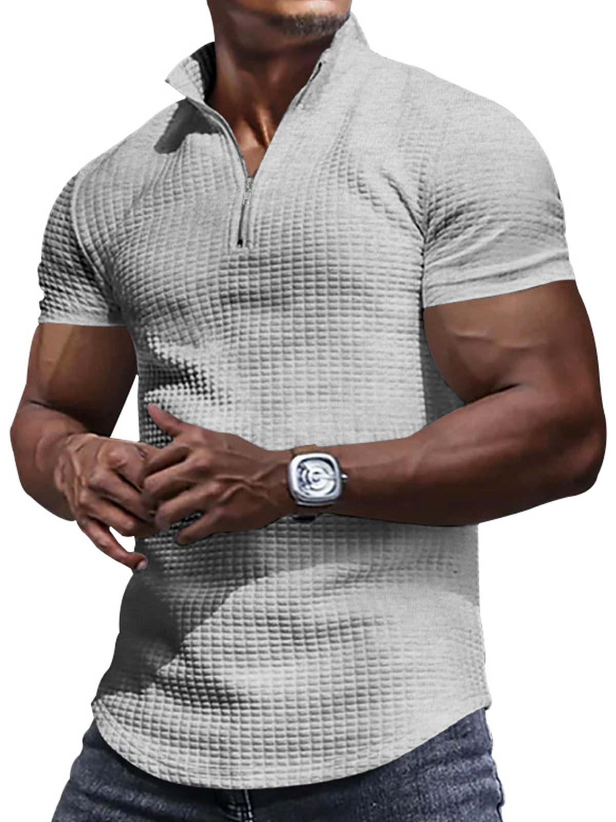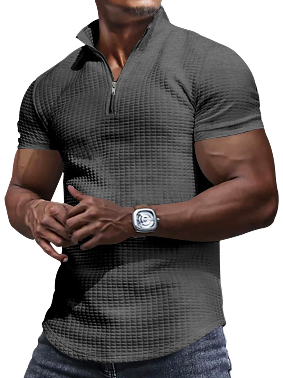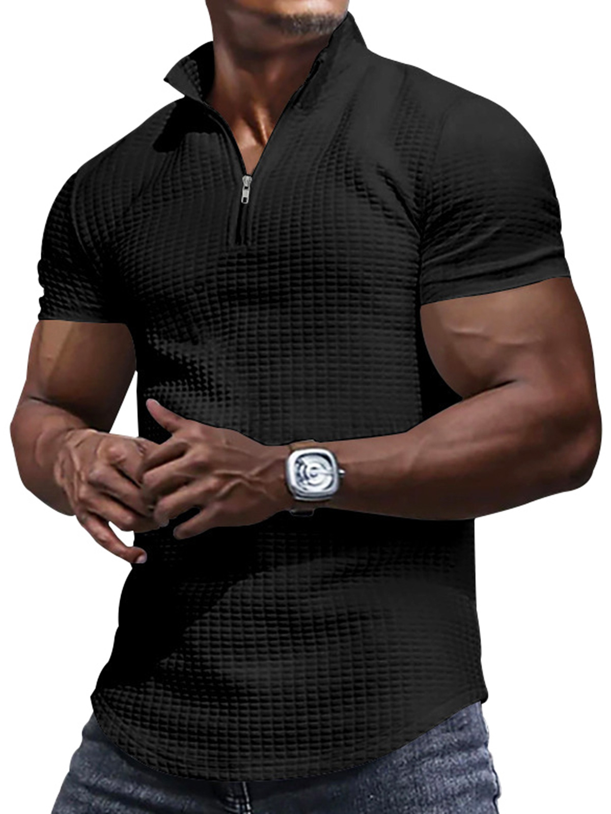 Men's Zipper Small Square Casual Solid Color Polo Shirt