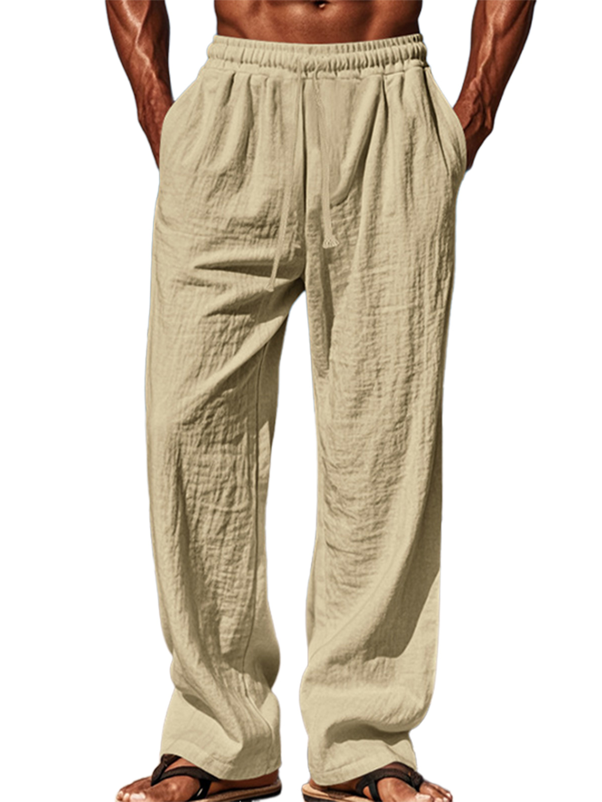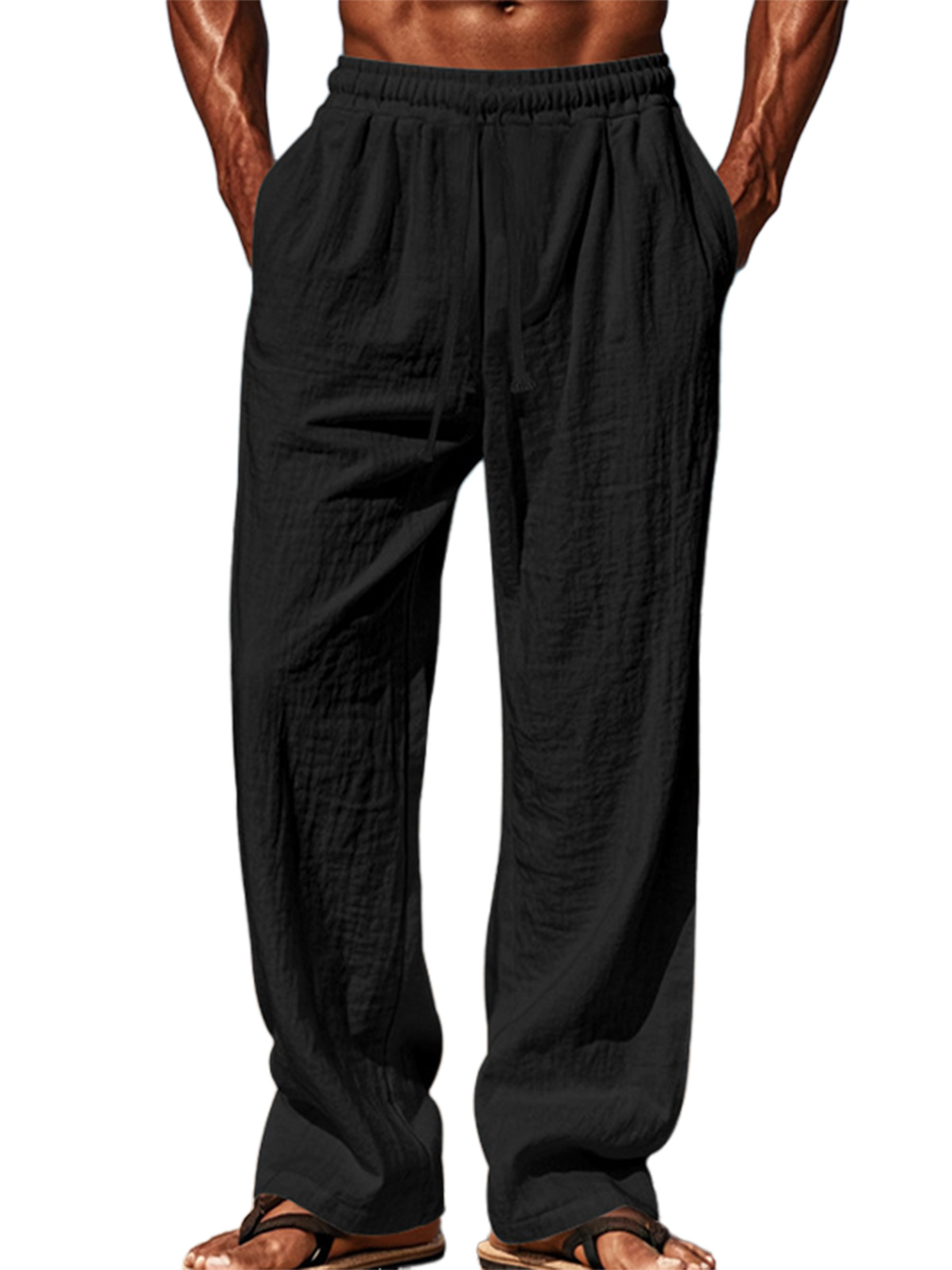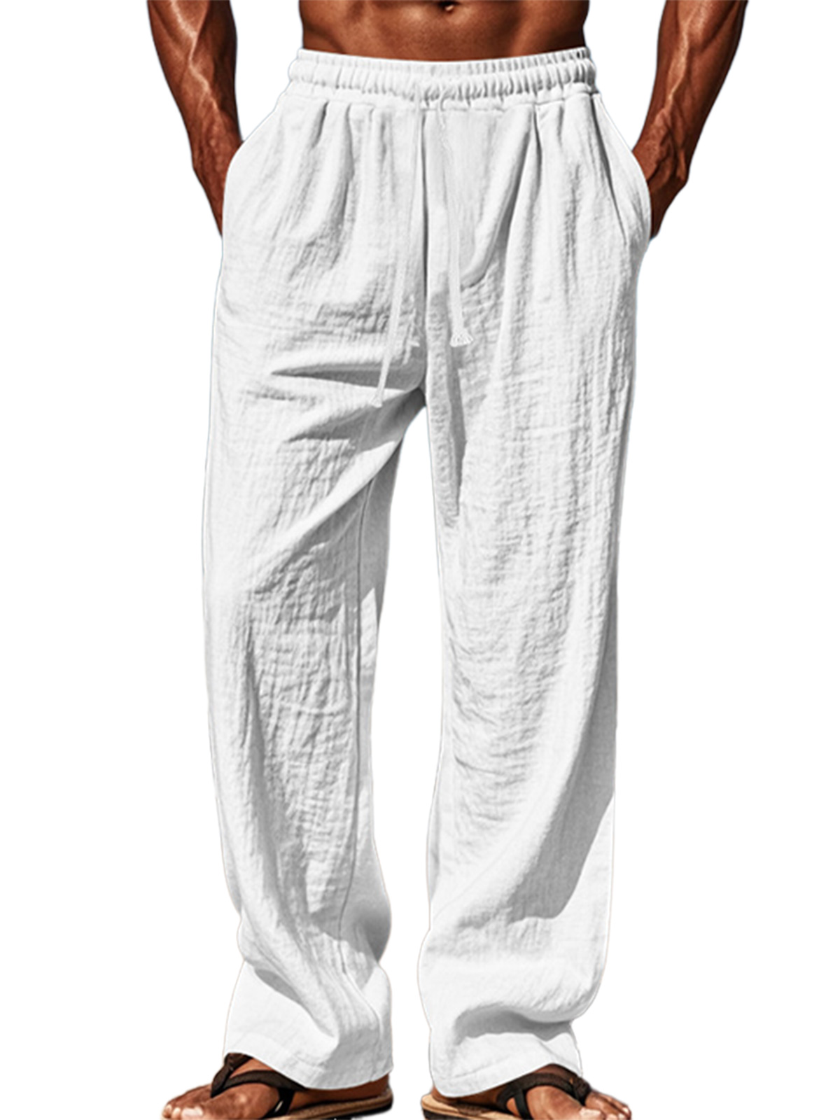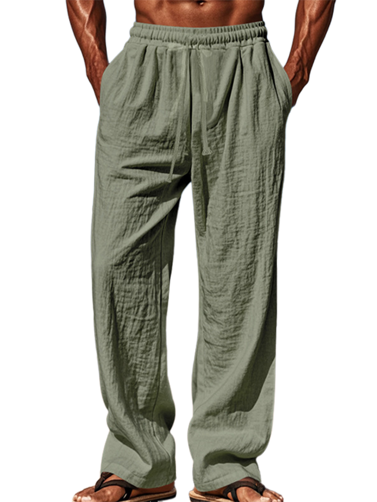 Men's pure cotton elastic waist solid color comfortable lace-up trousers